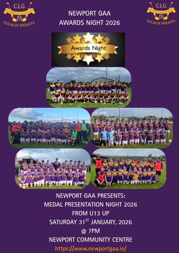 Newport GAA Juvenile Committee will hold an Awards Night in the Community Hall on Sat 31st January to present medals to the 2025 winning teams. With over a dozen championship, league and Féile trophies won in an unprecedented year of success, it promises to be a great night. All are welcome. Proceedings commence at 7pm.